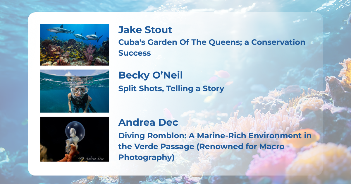 This month’s Photo Society meeting takes us beneath the surface to explore how storytelling, location, and thriving marine ecosystems come together in underwater photography. From learning how split shots can be used to tell a compelling visual story, to discovering the marine-rich environment of Romblon in the Verde Passage, renowned for its exceptional macro photography, our presenters will share insights, techniques, and inspiration from the field. We’ll also journey to Cuba’s “Queen of Gardens,” Jardines de la Reina, examining how strong conservation efforts have helped create a healthy and vibrant reef system, and what that means for underwater photographers.